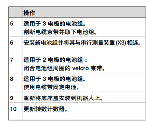 注意:當需要更換電池時,將會顯示電池低電量警告(38213 電池電量低)。建議在電池 更換完畢前保持控制器電源打開,以避免機器人不同步。 對于具有 3 電極觸點的 SMB 電路板(RMU101 3HAC044168-001 或 RMU102 3HAC043904-001),新電池的壽命通常是 36 個月。 對于具有2極電池觸點的SMB板,如果機械手斷電2天/周,新電池的通常壽命為36個 月;如果機械手斷電16小時/天,則為18個月。通過電池停機維護程序,可延長壽命 以延長生產中斷時間。